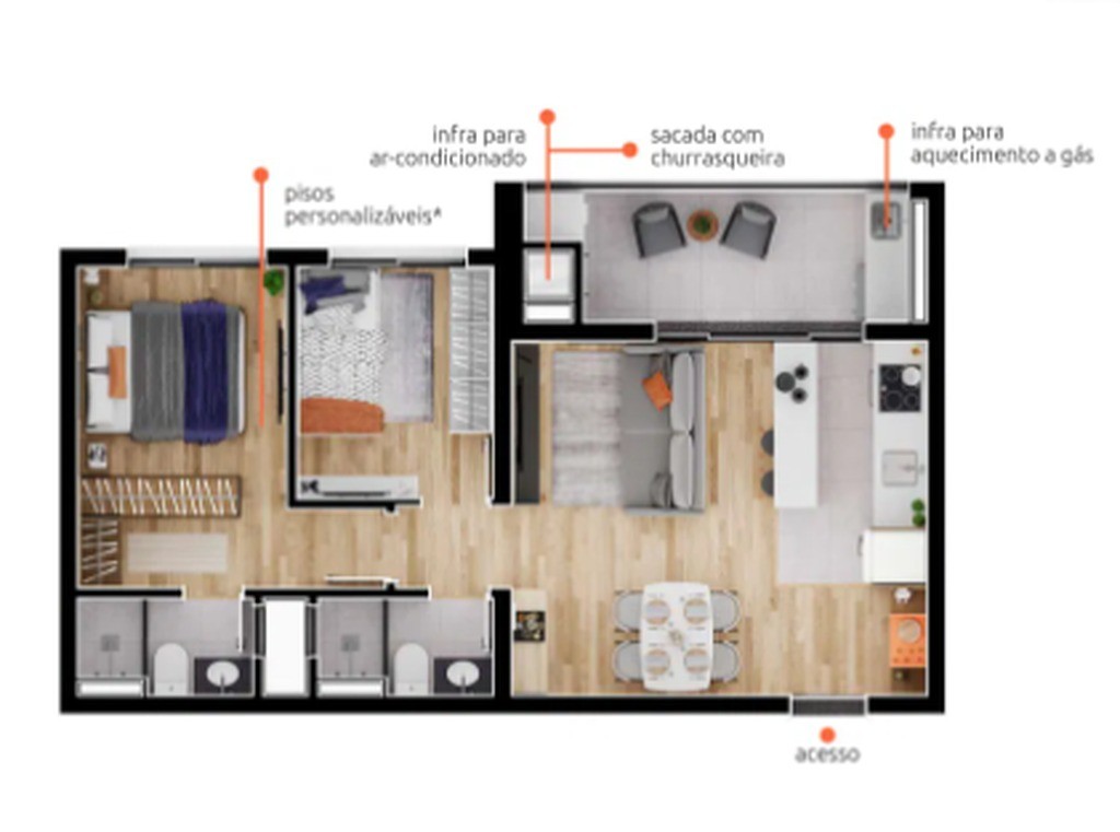Piso de todos os cômodos em porcelanato acetinado 90x90cm