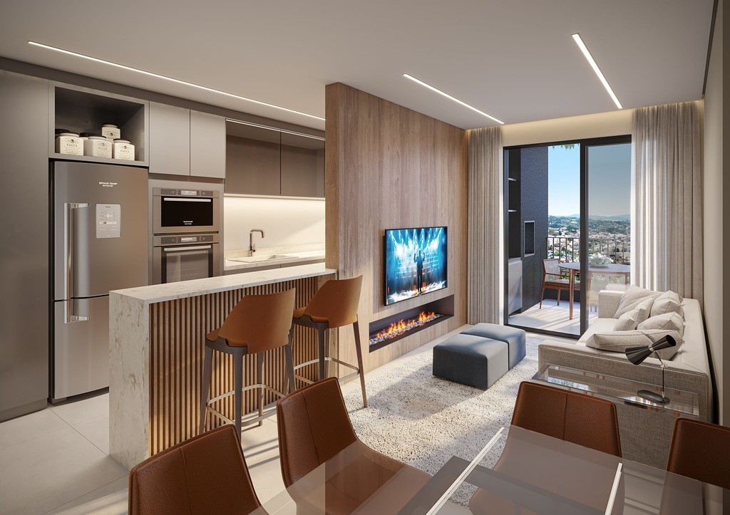 Sala de estar e jantar integradas, proporcionando um ambiente acolhedor