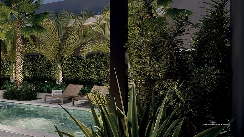 Piscina climatizada com solarium e deck molhado
