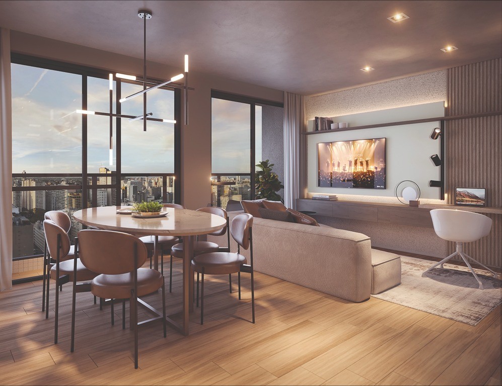 Sala de estar e jantar integradas, proporcionando um ambiente acolhedor