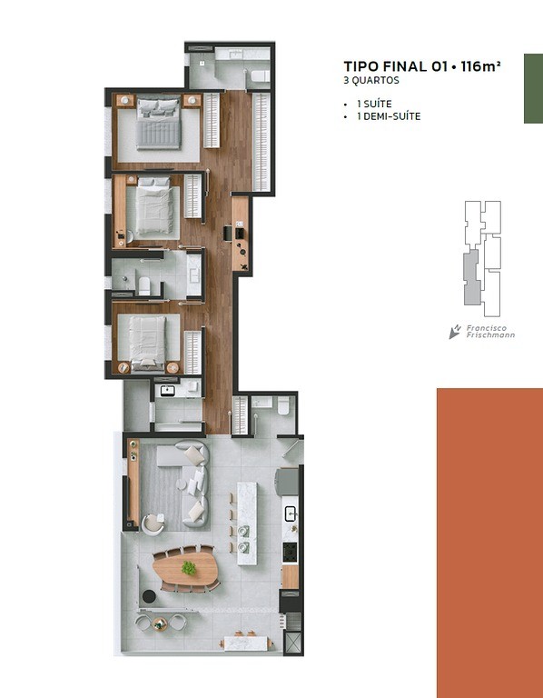 - Área privativa de 115,5 m² e área total de 195,5 m²