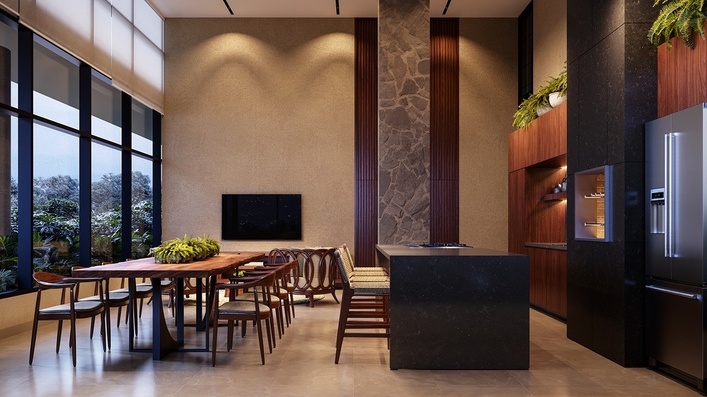 Sala de estar e jantar integradas, proporcionando um ambiente acolhedor