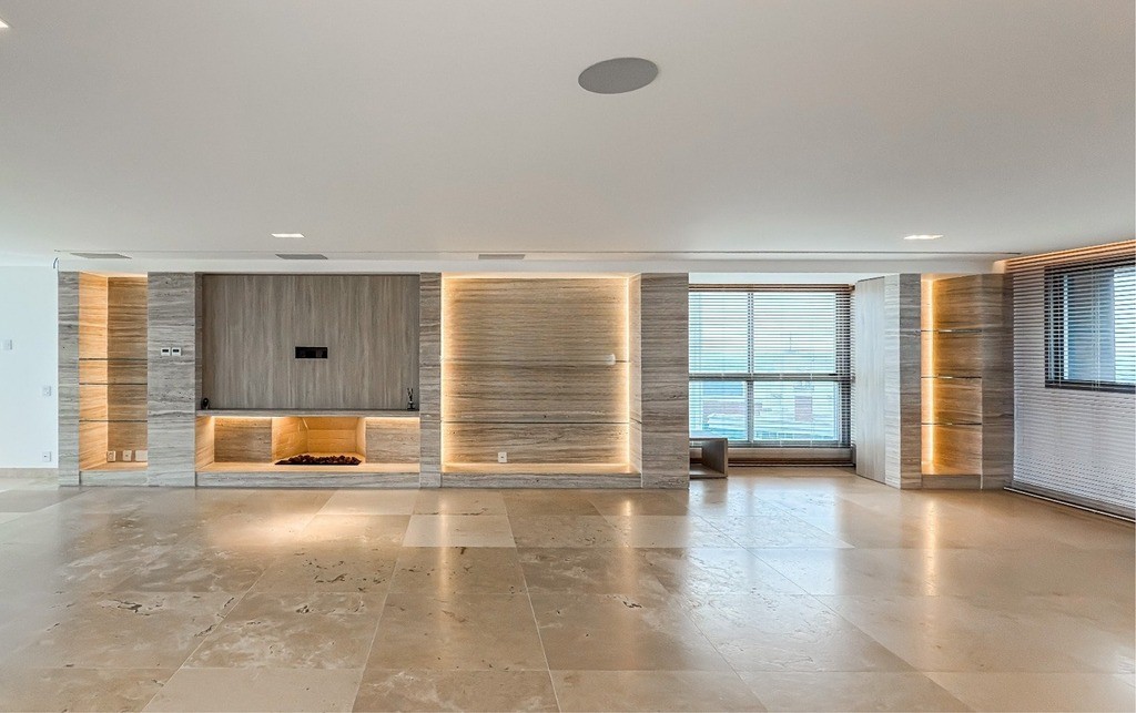 Amplo living integrado à sala de estar, com lareira a gás com controle remoto e sala de jantar com cristaleira