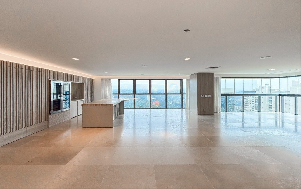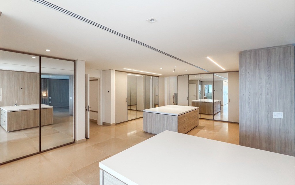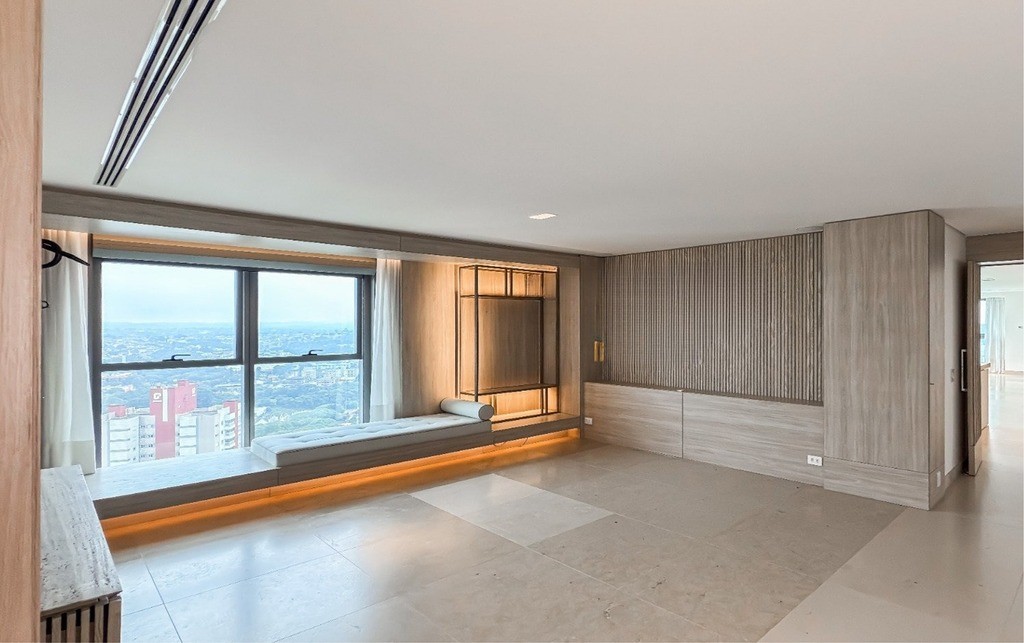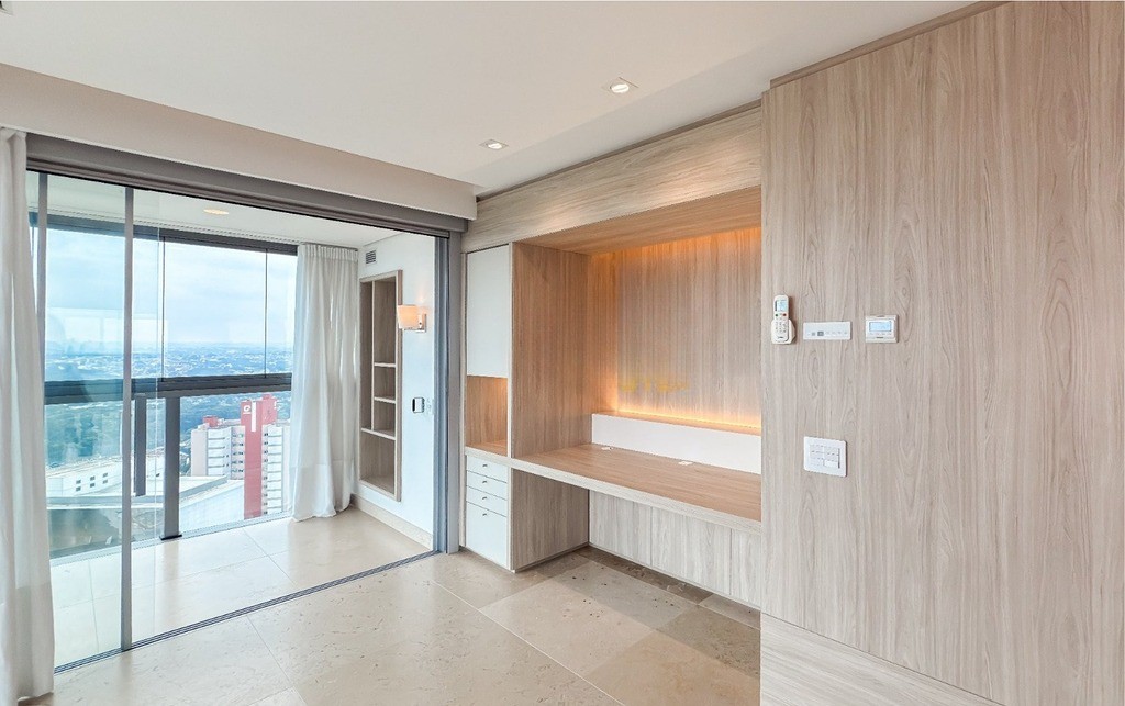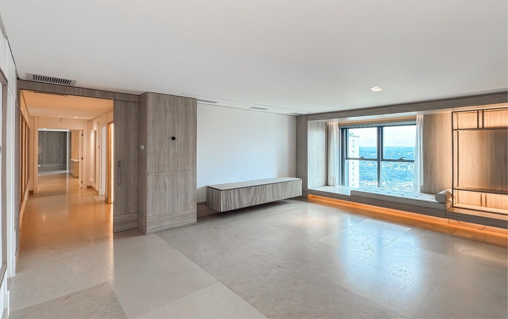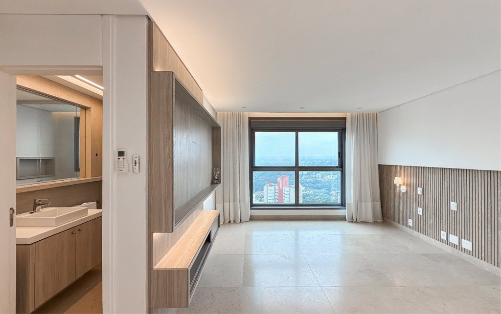 2 Suítes, sendo uma suíte master ampla com home office, sacada, dois closets e um banheiro luxuoso com banheira de hidromassagem Jacuzzi, chuveiros cascata de teto, toalheiros aquecidos e assento eletrônico washlet Toto (possibilidade de reversão para três ou quatro suítes)