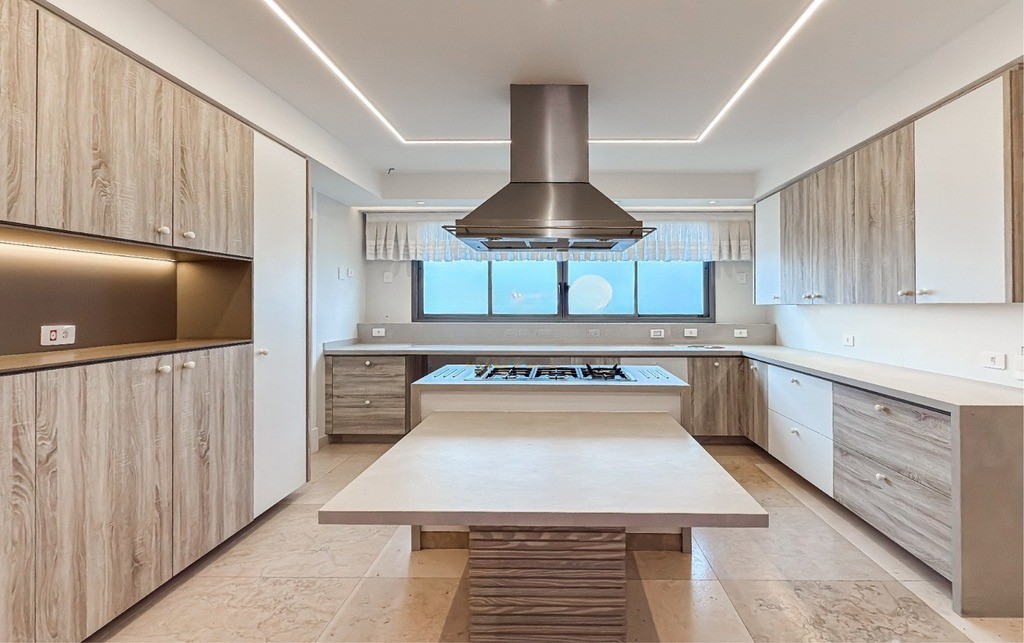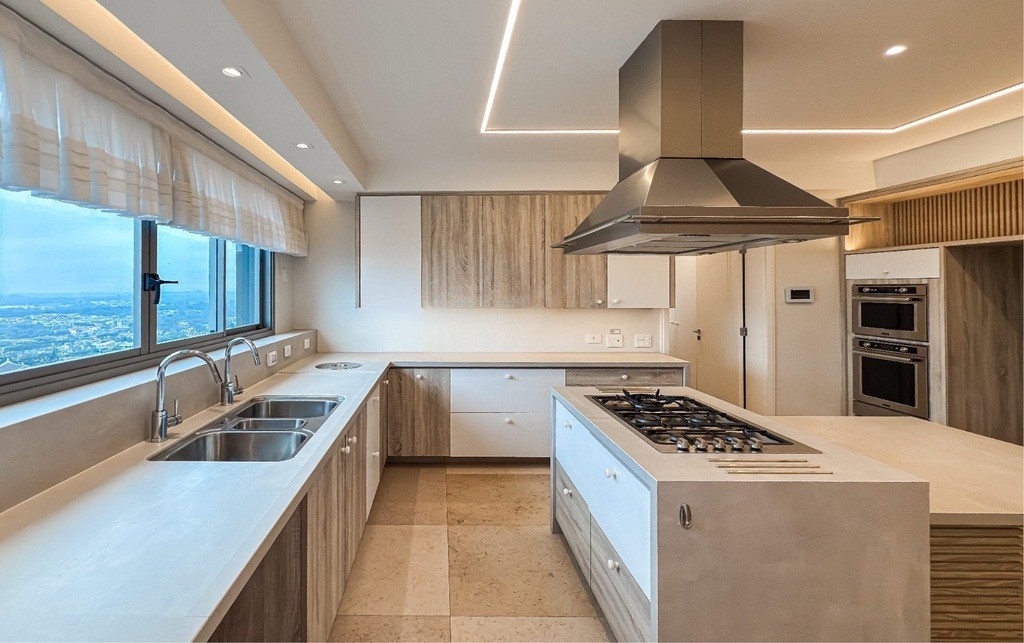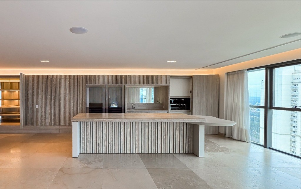 Cozinha com bancada em Dekton, coifa, cooktop em ilha, forno elétrico, micro-ondas e uma despensa espaçosa, oferecendo uma vista deslumbrante da cidade e da área de preservação
