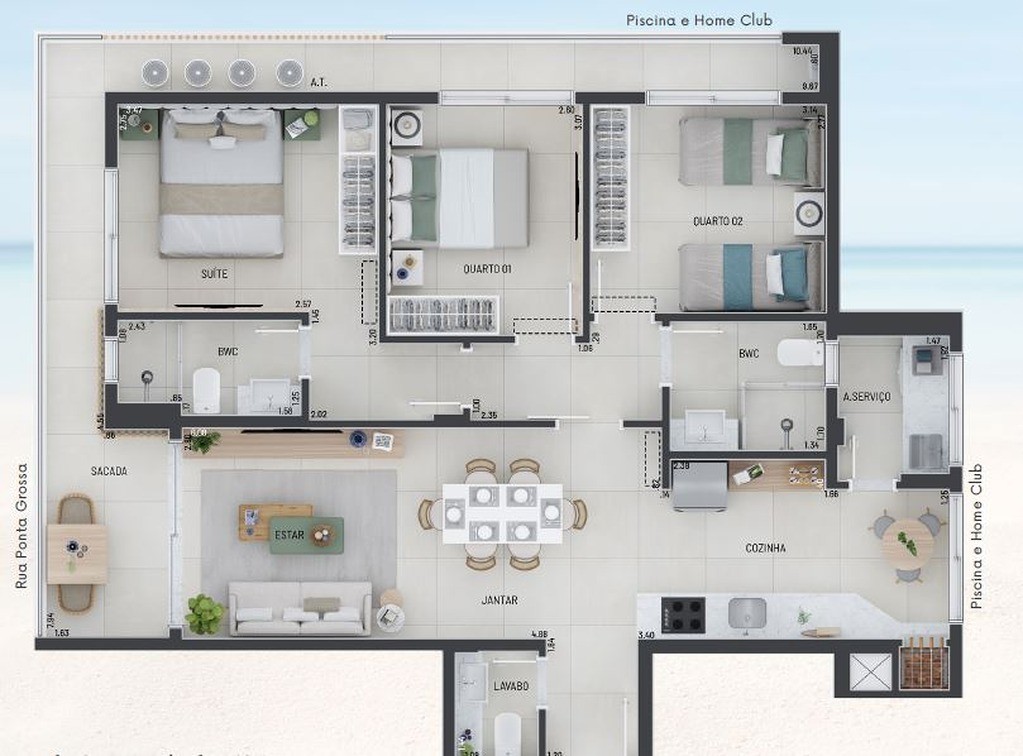 Com uma área privativa de 101,47 m², área privativa total de 123,67 m² e área total de 188,53 m², este apartamento oferece: