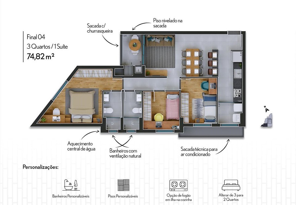 Com área privativa de 74,82 m² e área total de 116,82 m² , este empreendimento oferece: