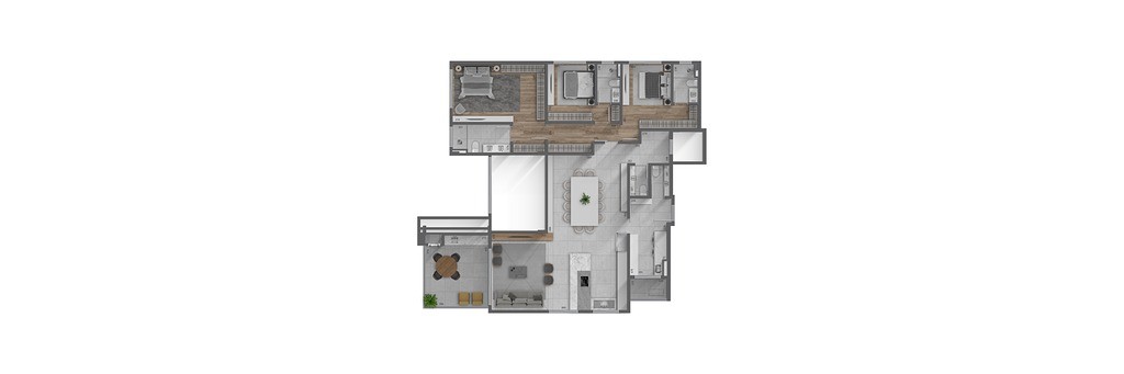 Revestimentos de piso entregues instalados: porcelanato nas áreas sociais e frias, e piso em madeira estruturada nas suítes