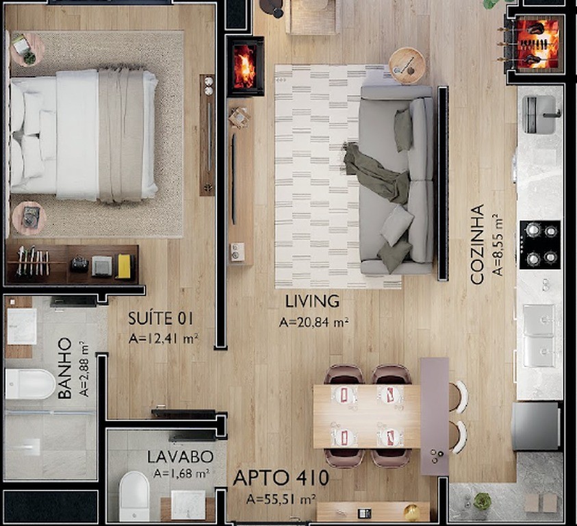 - Área privativa de 55,51m²