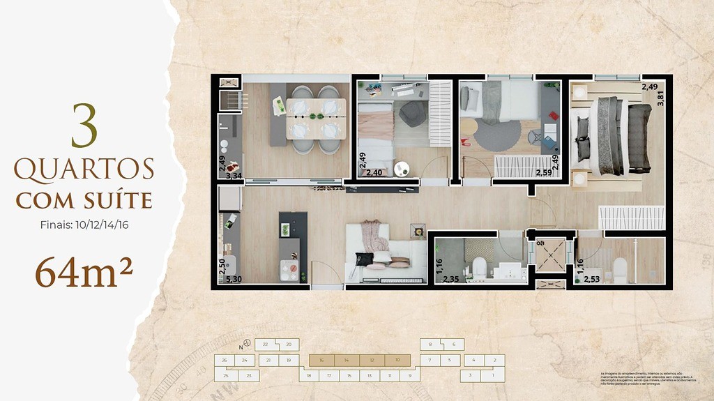 Com uma área privativa de 63,77 m² e área total de 119,86 m², este empreendimento oferece: