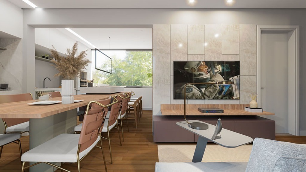 Sala de estar e jantar integradas, proporcionando um ambiente acolhedor