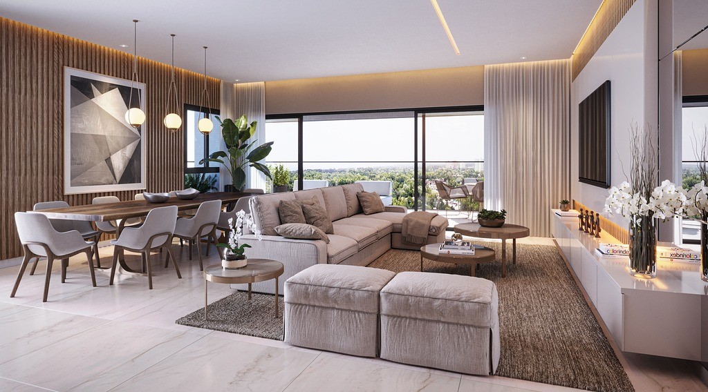 Sala de estar e jantar integradas, proporcionando um ambiente acolhedor