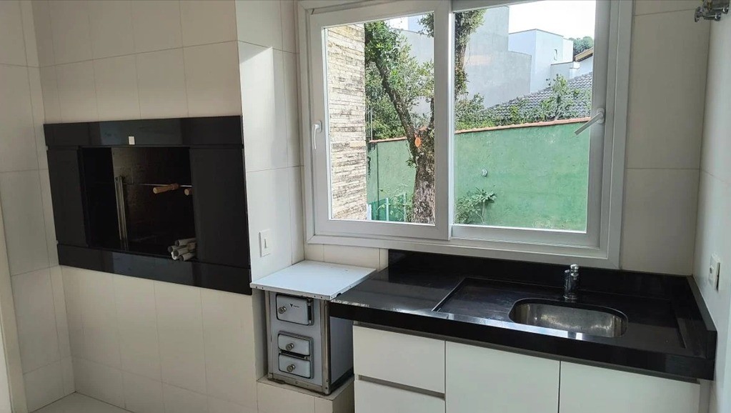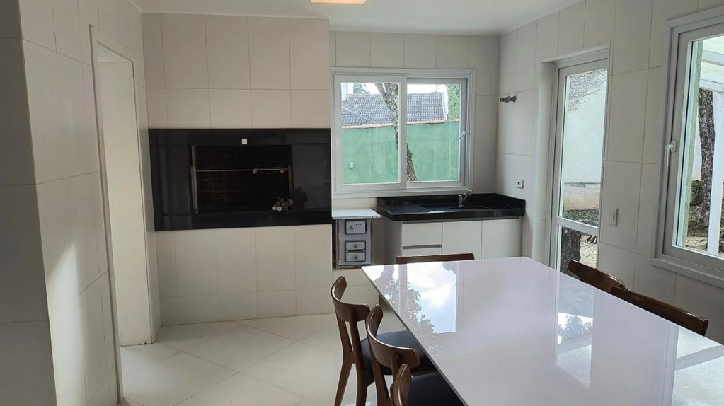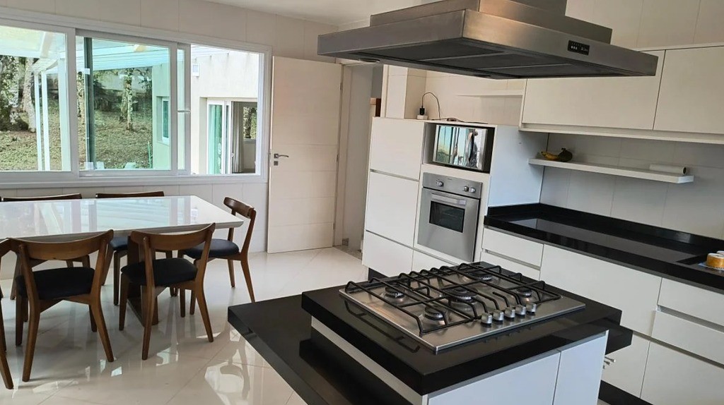 Cozinha estilo gourmet com fogão de ilha e churrasqueira integrada