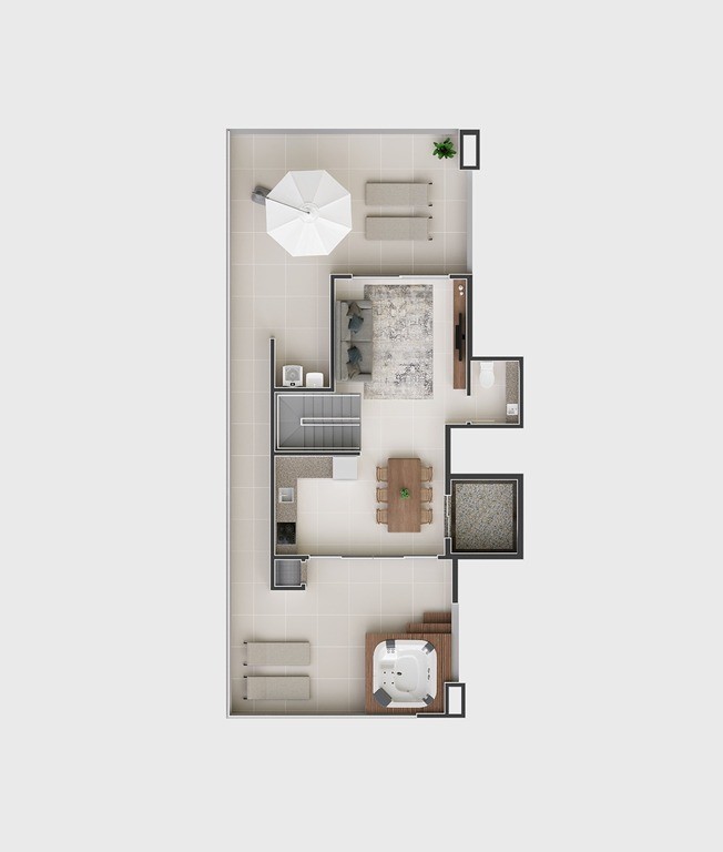 A cobertura foi pensada para atender famílias: são 4 quartos, sendo 2 suítes, sala de estar e sala de jantar amplas, cozinha generosa, ático, banheiro social, lavabo e vaga tripla de garagem, tudo isso com a possibilidade de instalar SPA ou piscina privativa, criando seu próprio espaço de relaxamento e lazer.