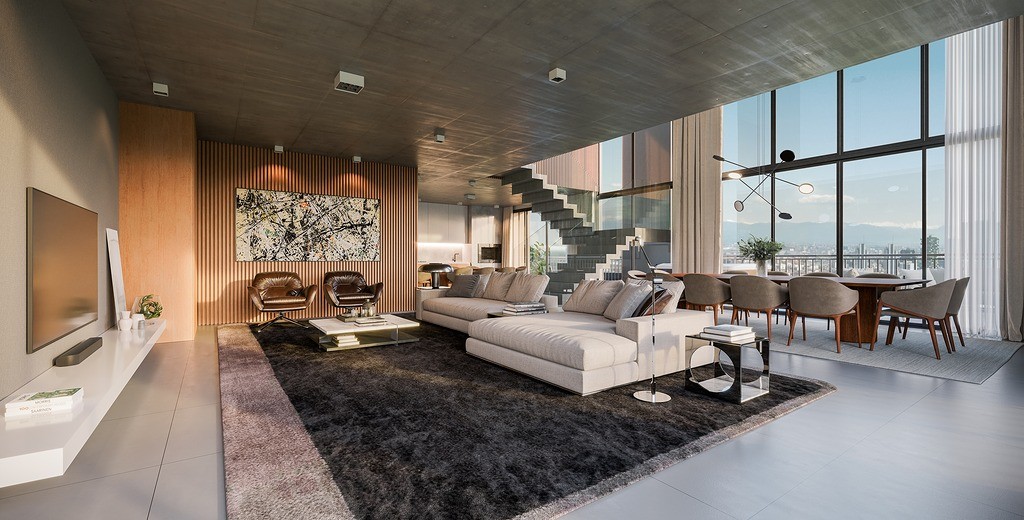 Esse duplex de 382 m² de área privativa, distribuído em dois pavimentos, é um verdadeiro refúgio urbano com arquitetura elegante, texturas naturais e iluminação que valoriza cada ambiente.