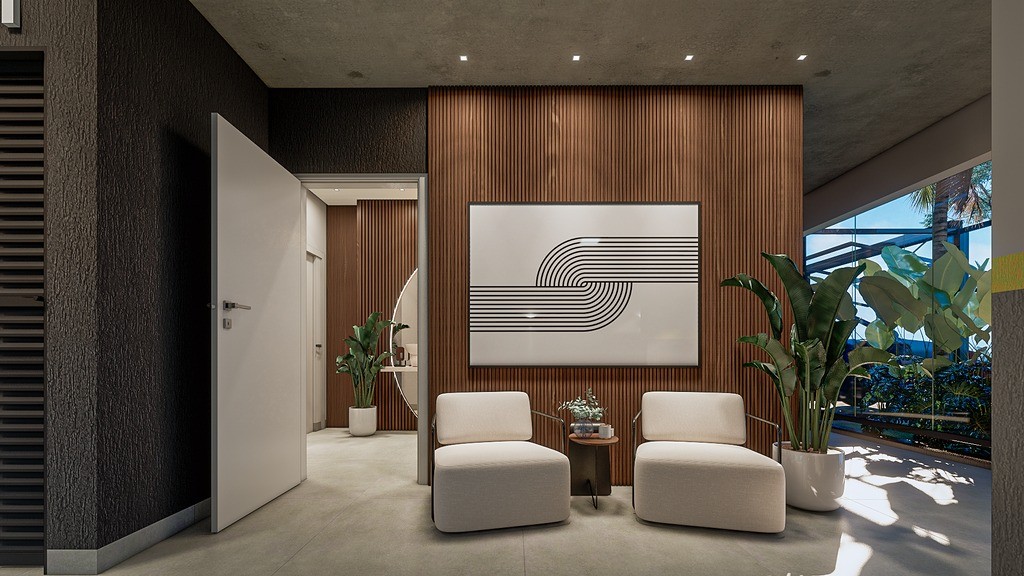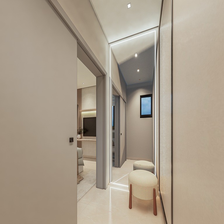 Hall de entrada com elevador social panorâmico, proporcionando uma chegada imponente e elegante